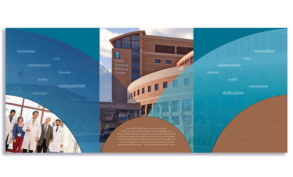 This custom pocket folder was the housing piece for a set of individual inserts addressing mental health, palliative care, and we are currently working on other development pieces as part of this package under their tagline, "Advancing Patient and Family Centered Care in Our Community." We were careful to keep the design within the parameters of AAMC branding guideline, yet push the visual drama with photography, and show the content in the context of the architecture and curves on the actual campus structures.