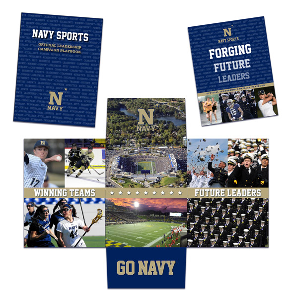 Brand-eye-dia assisted the NAAA with the creation of new development materials focused on the theme of “leadership” and the message that sports are an integral part of building the skills of future leadership in the U.S. Navy and beyond. Our recommendation was to create a “Navy Sports Playbook”— a flexible housing and brochure for a variety of materials that could be included in a collateral leave behind for personal one-on-one meetings with potential donors. Digitally printed pages could be bound on short notice to update the main brochure to provide information on key fundraising goals and benefits to supporters.