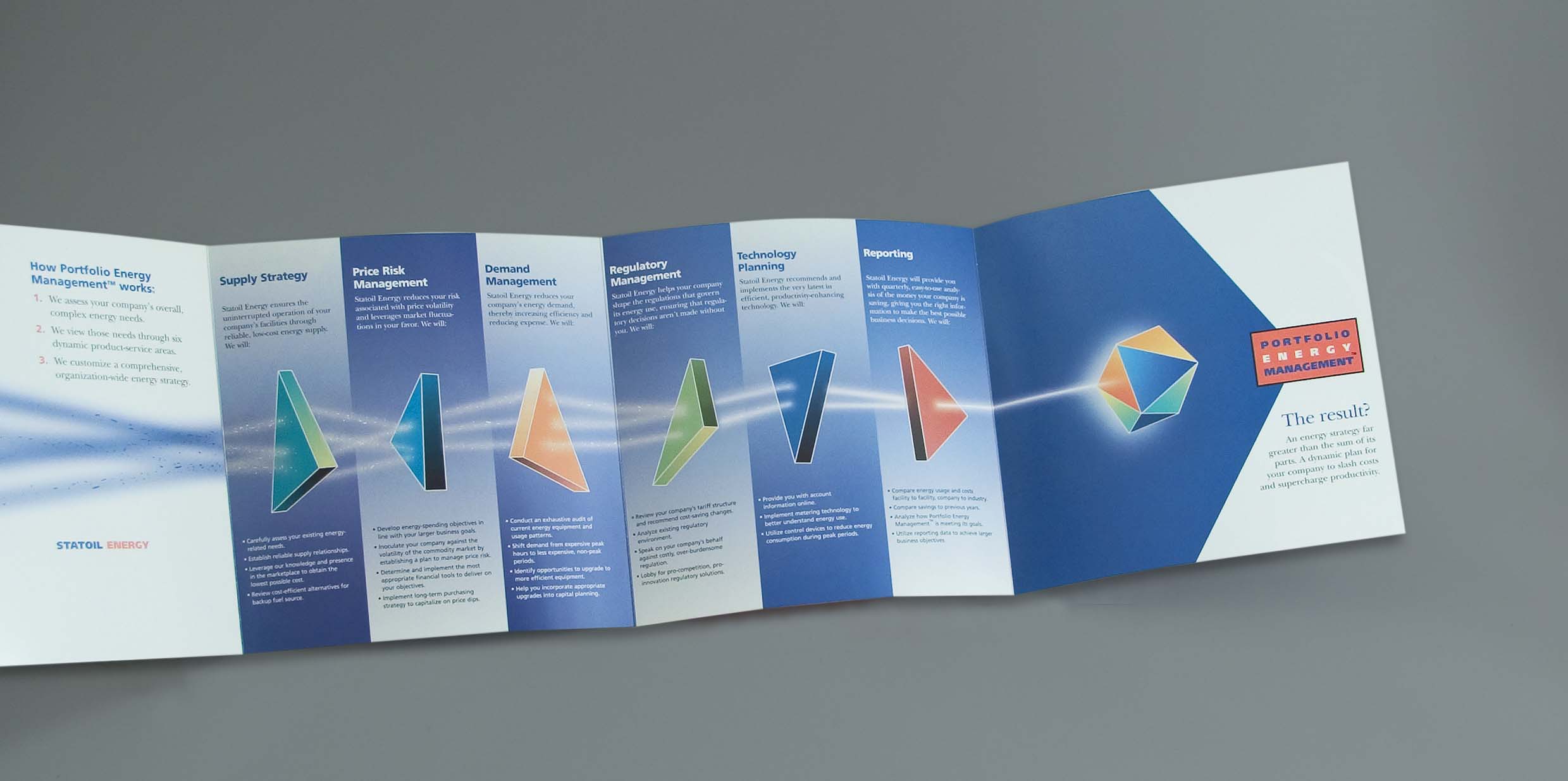 StatOil (now called Equinor) is a Norwegian energy company that was making the transition in the early 2000's from a traditional fossil fuel development company to an international, multifaceted energy trading company. We developed this design concept piece to explain the new business model to their customers and shareholders.
